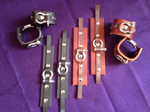The STAPLE is made of either black or brown 1/2 inch wide Latigo leather, a cattle hide leather which is used for saddlery work and numerous other outdoor uses, wherever a supple, durable leather is needed. It is available in various combinations of suede colors, including: rust, beige, black, turquoise, red, electric blue or purple, with metal beads and/or rivets.