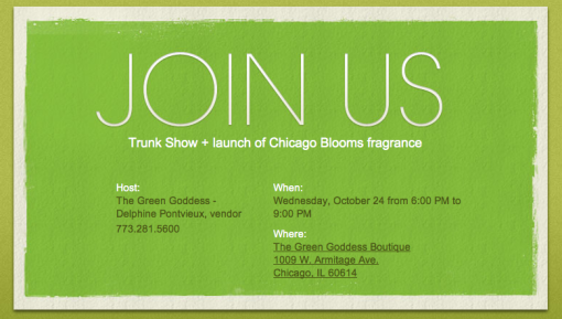 You are cordially invited to join us at the Green Goddess Boutique on Armitage for a trunk show and a cocktail party to celebrate the launch of Chicago Blooms fragrance.