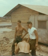 Robert Wilburn (no shirt, no grin, filling sandbags). The photo was taken in Vietnam in 1967,