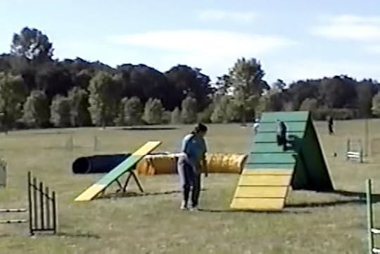 homeless and worst of all dog less. I have a few pictures from those years and amongst the few bits of my past that moved from a leaking storage barn and then with me from punk house to punk house was a VHS tape of some recorded runs – mostly from very early competitions. A couple years ago a dear friend who’s also a filmmaker offered to try to digitize the VHS- and it worked (I’d been afraid it was too damaged to save). Here is a short clip from some early novice runs of Snickers and I – this is the first time I’ve ever publicly shown any of this footage: