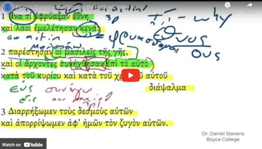In these videos, Daniel Stevens will begin an occasional series walking through the Greek text of several Psalms cited in the Epistle to the Hebrews. Starting with Psalm 2, these videos will consider the broader contexts of those passages cited in Hebrews and will provide viewers with an introduction to reading the Greek Psalter.