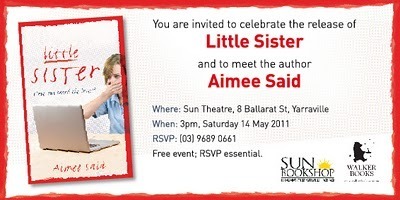 So, the 'official' Little Sister launch is in Sydney on 6 May. Being greedy, I really wanted to have some kind of celebration with my Melbourne friends, too. Luckily for me, the Sun Bookshop* has generously offered to host a do** on Saturday 14 May. I hope you can make it!