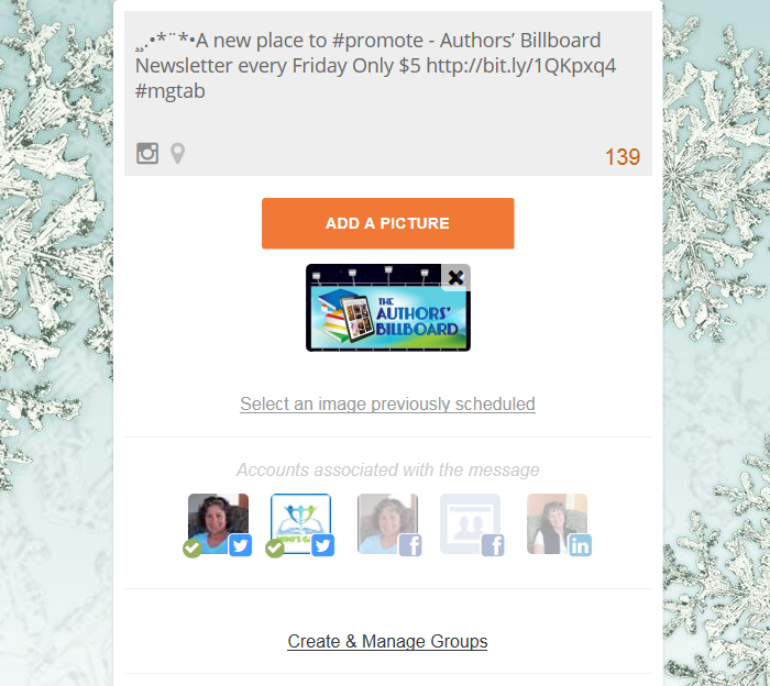 So… after playing around on Twittimer, I decided to go the Pro route for these reasons. One – I wanted to add both my Twitter pages – Mimi Barbour Author @MimiBarbour and The Author’s Billboard @mimisgang1. And two – I wanted to set up a sheet of tweets and forget about them. And three - $24.99 for 6 months seemed more than reasonable.