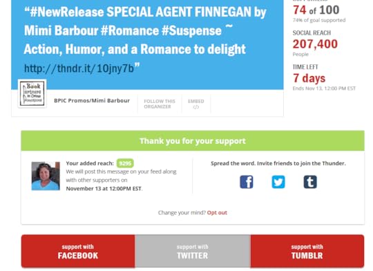 The permissions granted to us by Twitter and Facebook include some that we have no intention of using, which includes access to your friends list. We only post a single message to your account in support of your chosen campaign. We only store a token that is given to us by the social networks over a secure connection. We do not see your password, nor do we store it in our system. I kinda believe them because their success depends on this being true. Right?? When you sign in with your own twitter or Facebook, it's kinda cool. The numbers on the side will shift and one will be added. Once there are 100 people, on the set date, Thunderclap sends out all of the tweets, facebook posts and tumblr at once. And the hope is that other friends will share and retweet. They do not charge for a Thunderclap at the level authors wish to use it but there is a premium account for larger companies. Plus, it’s very simple to use.