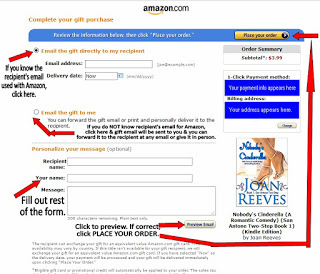 If you do not know your recipient's address, just follow the directions on the diagram at the left. Basically, you just click to buy (arrows on diagram show where) and a gift email will be sent to you. Then you can forward it to the recipient at any email or give it in person. They can then go to Amazon and claim their gift.