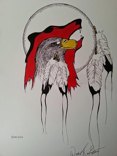 A young native man stepped up behind me. He reminded me of a fellow I knew and cared about as a teenager, only this young man’s hair was quite long, decorated with a feather attached on one side. His black leather vest had some beautiful Indian artwork and matched the black of his sleeveless t-shirt and jeans. His tattoos were indicative of his culture and I thought him handsome. Maybe the pot-marks on his face spoke of earlier hard times but this day he looked clear-eyed, healthy and strong.