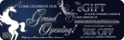 Oh! And before I forget…we offer a wide range of gift certificates designed specifically with the writer in mind. Tired of searching for the “write” present for your author pals? Maybe that next birthday calls for an eGift from Mystical Press!So now that you know all about us, please tell us all about you! Head on over to Mystical Press and register free on the site. Everyone who does will be entered into our drawing for fabulous gifts and prizes! Join our celebration and together we will strive to get your voice heard!