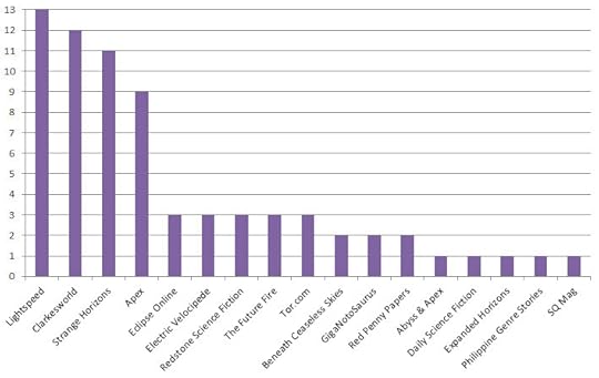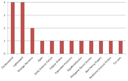 To start, if you’d asked me what my favorite online magazine is, I would have said Strange Horizons or Clarkesworld. However, a look at the numbers reveals that of the 55 stories published in 2012 that I liked, Lightspeed published most of them (14, to be exact). Clarkesworld is a close second with 11 liked stories. Then after that Strange Horizons and Apex Magazine tie at 6 with Electric Velocipede right behind them with 5. Apparently, my tastes match up with John Joseph Adams’ pretty regularly.