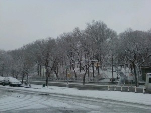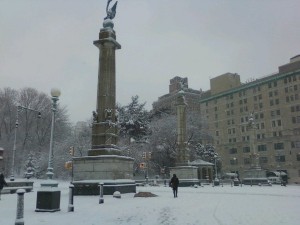 The story itself was inspired by an especially snowy February we had here in New York. There were two blizzards that dropped a significant amount of snow on the city. When the first was predicted, New York City preemptively closed the public schools and a number of offices decided to shut down. The photos in this post are all from that particular blizzard, and from my walk down Eastern Parkway in Brooklyn, across Grand Army Plaza and the main entrance to Prospect Park and down Prospect Park West (captions shown).Kindling Fire with Snow centers around a blizzard. It's a blizzard on this level, one that essentially shuts down the city.