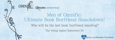 A couple weeks ago I told you that the authors of Omnific Publishing had their panties all twisty over an impending competition between our men. Well, the competition begins TODAY. The guys from our books will step off the pages to go head-to-head (-to-head in some cases) and YOU get to vote on which one makes you most giggly inside.