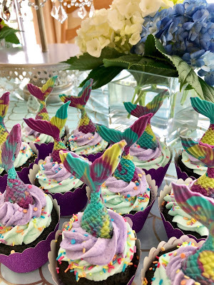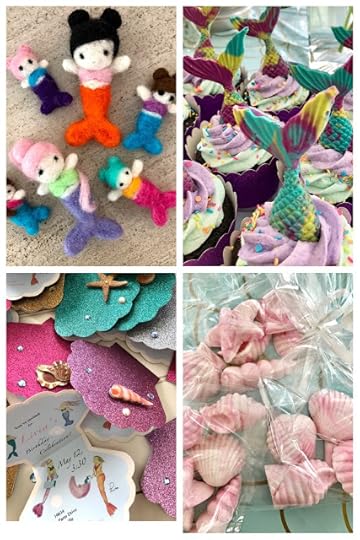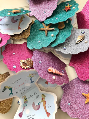 I like for my girls to be involved as much as possiblewith making their invitations and party favors. My daughter used watercolors to illustrate the mermaids.She did a fabulous job; I loved how they turned out!I created the seashell template and together we cut, pasted,
