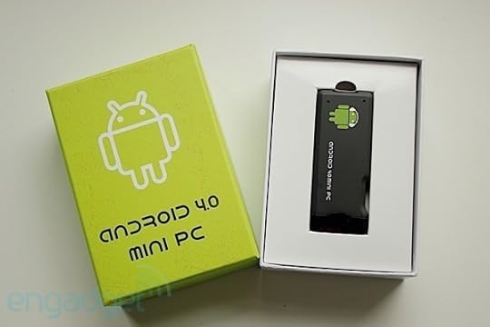 It is slightly larger than a thumb drive, with cable connections all over it. I plugged it into the HDMI connection on my TV, then plugged it into the USB on my TV (for power), and boom. I had a working, hi-def Android system hanging off of my TV.
