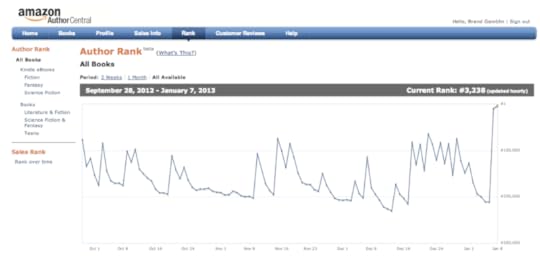 On the 7th, when the ad hit, the book dropped in Amazon rank from around 380,000 down to #1295 in total Kindle books. It was #18 in Kindle Sci-fi/Adventure, and #25 in Books Sci-Fi/Adventure. So that was pretty cool. here is a graph showing the level of difference that sale made: