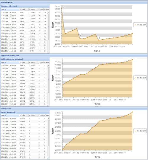 Now look at point 2. Clearly, there has been another sale, but this one has far less change. Whereas the previous sale dropped our rank by 37k, this one only dropped by 15k. The interesting thing to note here is what happened to Hidden Institute and Danny at the same time. As soon as Amazon realized that there were multiple sales in a short time, they halted the rank drop for both of my other books.