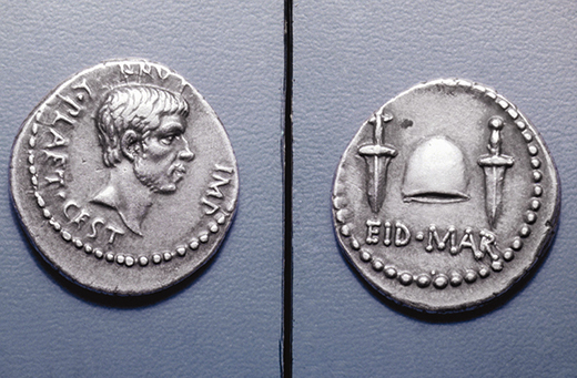 This coin, issued by Brutus, one of the plot’s ringleaders, displays the military daggers employed against Caesar. © Topfoto