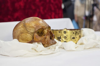 The cranium in the reliquary is said to be dented by one or two healed wounds that may have been due to weapons. (