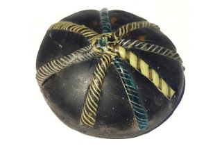 This glass counter decorated with twisted colorful strands was discovered at the site.