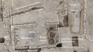 Featured Image: Site of the 2,100-year old Roman tavern, featuring the pits of taboon ovens for bread, a huge dining section to the right, a drainage system and millstones. Source: Lattes Excavation