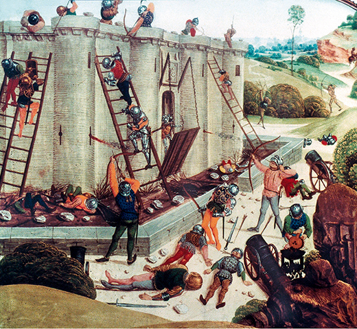 A castle is stormed in this 15th-century illumination. To repel attacks, castles were often furnished with heavy weaponry. © Topfoto