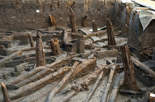 Collapsed roof timbers are seen at the site of a well-preserved Bronze Age dwelling at a quarry in Peterborough.Cambridge Archaeological Unit
