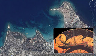 Featured image: Main: Google Earth image shows the general vicinity of the islands, near Bademli Village in Turkey on the Aegean Sea. Inset: A representation of an ancient Greek ship on pottery (Photo by Poecus/ Wikimedia Commons )