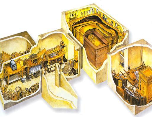 View Caption +#4: King Tut's Tomb in 3-D Tutankhamun's tomb and its contents, as viewed in a 3-D model. A corridor led to an antechamber and an annex filled with objects. The antechamber opened into the coffin chamber with King Tut's sarcophagus. The coffin chamber led to another small room filled with King Tut's treasures.