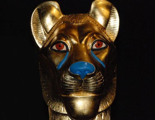 View Caption +#7: Lion Head The dead king in the underworld was akin to the sun at night and, in the New Kingdom, this was identified with the god of death, Osiris. The heads of lions corresponded to the time the sun god spent in the body of the god of heaven in feline form. The facial details of the lion head –- the rims of the eyes, tip of the nose and tear ducts -- are given almost life-like properties through the use of glass.