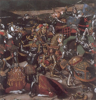 1513 The Battle of Guinegate (near Saint-Omer in the Pas de Calais, France)or Battle of the Spurs: As part of the Holy League under the on-going Italian Wars, English and Imperial troops under Henry VIII and Maximilian I surprised and routed a body of French cavalry under Jacques de La Palice. The English army was provided by Cardinal Thomas Wolsey and combined several different types of martial forces, and included cavalry, artillery, infantry and longbows using hardened steel arrows designed to penetrate armor more effectively. The French forces were mostly companies of gendarmes and pikemen, with some other mixed forces as well. The battle became known as the "Battle of the Spurs" because of the haste of the French horsemen to leave the battlefield.
