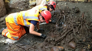 Featured image: Crossrail archaeologists excavate an apparent mass grave at the Bedlam hospital cemetery ( Crossrail photo )