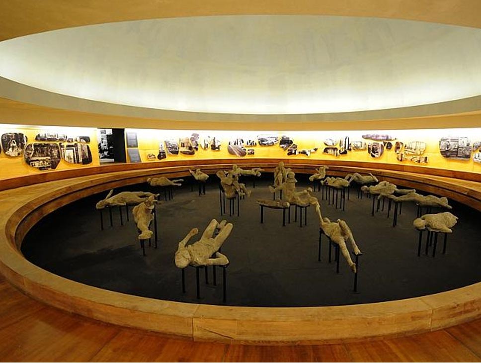 The exhibition of plaster casts of 20 victims of Mount Vesuvius' eruption are on display in a wooden pyramid in an ancient amphitheater through September 27, 2015. The people and some animals were carbonized by a gas cloud of 300 degrees C (572 degrees Fahrenheit). The actual bodies, which were ossified by the heat, will not go on display but rather the plaster casts that show the exact position the bodies were found in.
