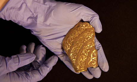 More than 1,500 scraps of silver gilt foil from the Staffordshire hoard of Anglo-Saxon treasure, including strips stamped with designs of warriors and beasts and other fragments the size of a fingernail, are being pieced together by archaeologists and conservators into a warrior’s helmet of international importance – as it is one of only five ever found.