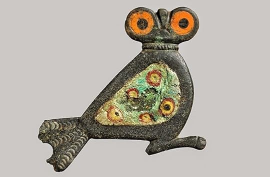 Cast as a flat piece of bronze and decorated with green enamel and glass disks in brilliant red, yellow, and black colors, the brooch is shaped like an owl and dates between 100-250 A.D.