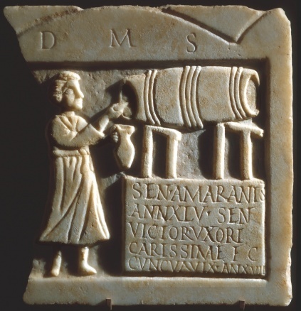 A man refills his cup from a wine cask in this first-century AD Roman relief. (akg-images)
