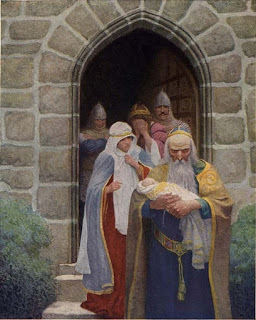 According to legend, Arthur’s father, Uther Pendragon, fell in love with / lusted after Igraine, the wife of Gorlois of Cornwall, whose fortress was at Tintagel. Uther managed to persuade Merlin to use his magic to fulfil his desire. Merlin transformed Uther into the image of Gorlois, and he was able to enter Tintagel Castle to seduce the queen. It was by this way that Arthur is said to have been conceived.