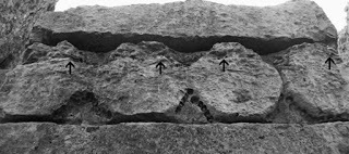 Detail of the entablature of the Lion Gate relief, showing the location of tubular drill holes and saw marks. The arrows indicate the erroneous saw cut and the unknown filling material within it. ( Blackwell/AJA 2014 )