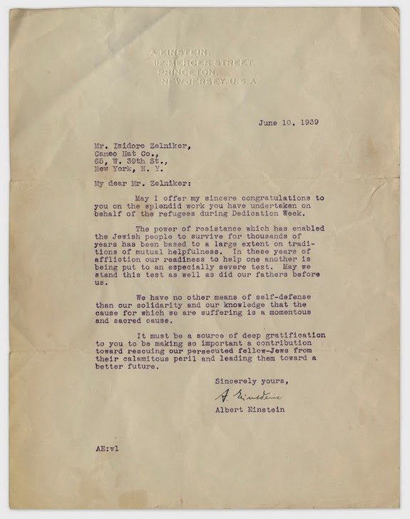 The letter, typed on Einstein's personal stationary, is dated June 10, 1939, and was sent from the scientist's residence on Mercer Street in Princeton, New Jersey, to Isidore Zelniker, a Jewish hat merchant in midtown Manhattan.