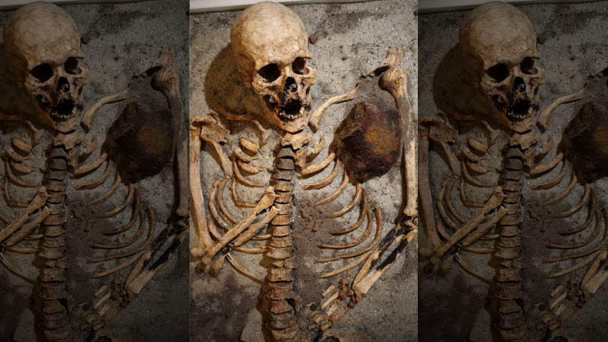 skeleton pierced with a piece of iron is seen on display during a media event at the National History Museum in Sofia June 14, 2012. This is one of two 700-year-old skeletons discovered with iron rods pierced through their chests. Archaeologists, excavating a monastery near the Black Sea city of Sozopol, discovered the skeletons. (REUTERS/Stoyan Nenov)