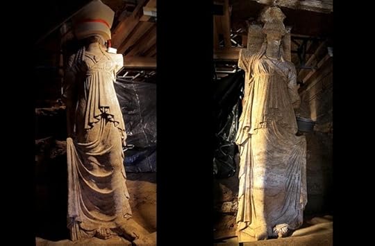 Carved in high relief of Thassos marble, the imposing twin statues, known as Caryatids, stand between two marble pillars supporting a beam. They were "buried" in the ground, sandwiched between two walls, one sealing the statues off and the other closing another chamber.