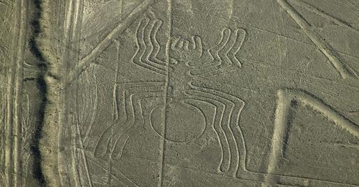 View Caption + In case you don't know what a geoglyph is, ancient Peruvians went through the trouble of leaving a picture-perfect definition. Known as the Nazca Lines, these giant carvings into the Earth were only discovered by airplane in the 1930s. Located in the Nazva desert in southern Peru around 250 miles (400 kilometers) south of Lima, the geoglyphs resemble a number of animals including a spider (as seen here), a condor, a monkey, a tree, as well as human figures and geometric patterns. Why exactly indigenous tribes living in the area between 100 B.C. and 650 A.D. felt compelled to produce these works remains a mystery, though archaeologists agree that it is likely tied to religious customs.