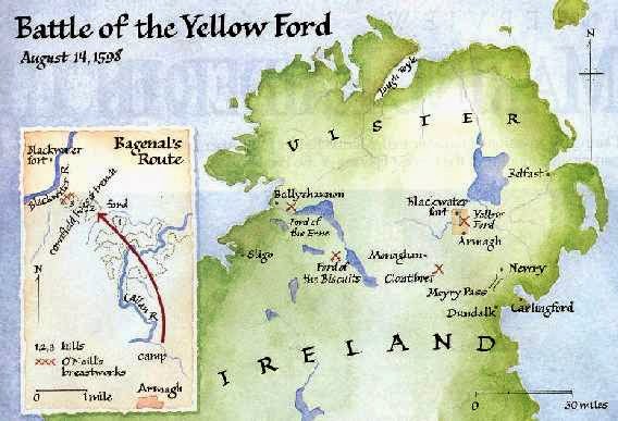 1598 Nine Years War: Battle of the Yellow Ford: Irish forces under Hugh O'Neill, Earl of Tyrone, defeated an English expeditionary force under Henry Bagenal.