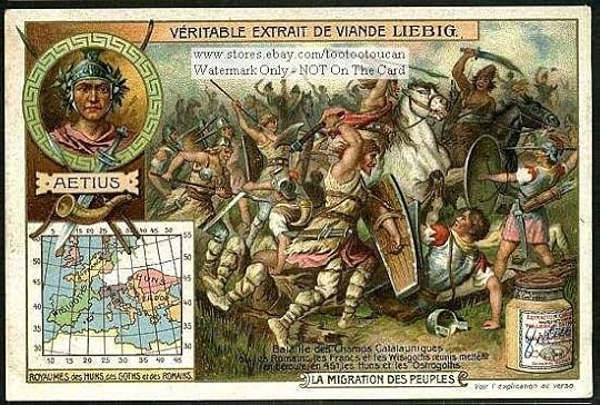 451 Battle of Chalons: Flavius Aetius' defeated Attila the Hun at Catalarinische Fields. Theodorid, King of the Visigoths was mortally wounded in this battle.
