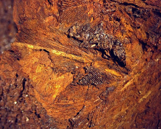 Feather residues in corroded iron from a Viking sword. Perhaps the sword was laid on a pillow? Photo: Jørgen Rosvold, NTNU University Museum