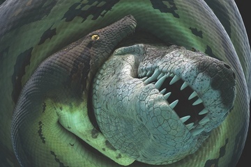 An animation from a Smithsonian Channel documentary shows a dyrosaur being constricted by the "monster snake" Titanoboa.