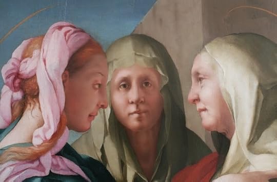 The younger of the two wears the same color clothing of the Virgin Mary, but reversed. The older one appears to be Elizabeth shown in a sort of doubling.