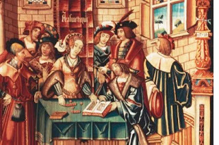 A loan transaction being recorded in a ledger, shown in a Flemish tapestry known as The Liberal Arts – Arithmetic, of around 1520. (Getty)