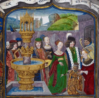 Detail of a 15th-century miniature depicting an allegorical court of love (Royal 16 F II, f. 1) British Library