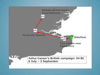 The first evidence for Julius Caesar's invasion of Britain has been discovered by archaeologists from the University of Leicester. Based on new evidence, the team suggests that the first landing of Julius Caesar's fleet in Britain took place in 54BC at Pegwell Bay on the Isle of Thanet, the north-east point of Kent.