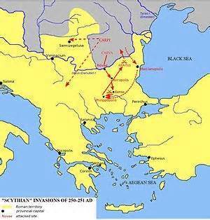 251 Battle of Abrittus: The Goths defeated Emperor Decius and his son Herennius Etruscus on swampy ground in the Dobrudja (Moesia).