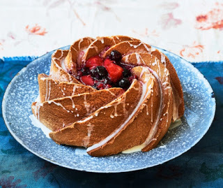 To make the frosting, stir the orange or lemon juice into the sifted confectioner's/icing sugar, then drizzle over the cake. Fill the centre of the cake with fresh fruit such as raspberries or cherries.
