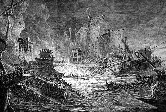 1453 The last naval battle in Byzantine history occurred, as three Genoese galleys escorting a Byzantine transport fought their way through the huge Ottoman blockade fleet.